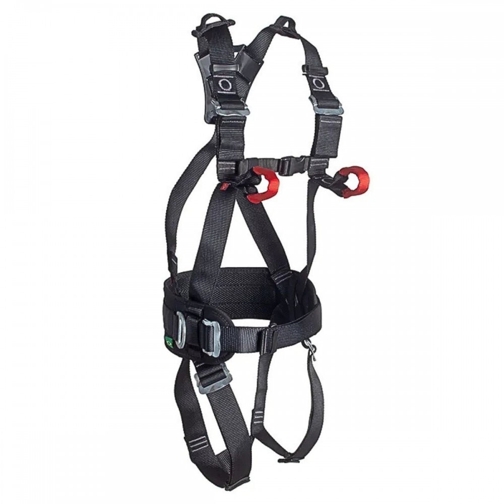 Cinto de segurança tipo PQD com quatro (04) pontos de ancoragem: um (01) ponto dorsal (A) em anel de aço em “D”, um (01) ponto frontal formado por dois “loops” confeccionados em fita de poliéster dupla com proteção em PU injetado, que devem ser utilizados juntos (A/2), um (01) ponto de ancoragem na cintura, formado por dois anéis curvos para trabalho em posicionamento, e mais um (01) ponto nos ombros composto por dois suportes de fita reforçados para conexão do Arco de Suspensão através de malhas rápidas. Este sistema deve ser utilizado em trabalhos em suspensão (espaços confinados) ou em situações de resgate;